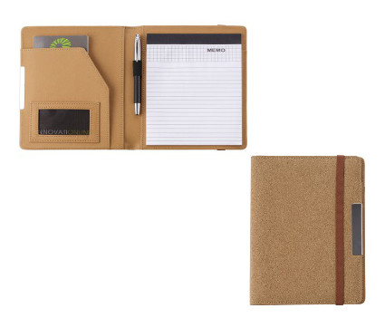 A/4-es méretű parafa gumis mappa, PU belsővel, névjegytartó zsebbel, 20 lapos jegyzettömbbel és tolltartó füllel (a tollat nem tartalmazza).