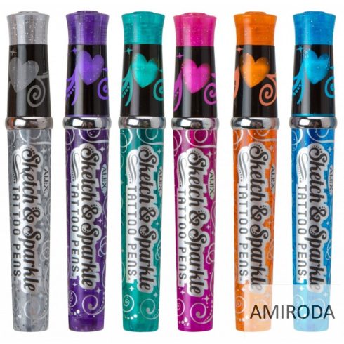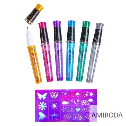 Tetováló csillámos toll készlet, 6 szín + 6db sablon, lemosható